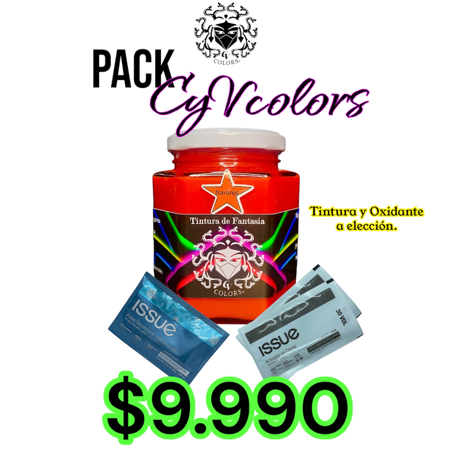 Kit de tintura CyV colors que incluye: una tintura de 320cc frasco de vidrio + decolorante issue sin amoniaco + oxidante a elección (sujeto a disponibilidad 20% o 30%).